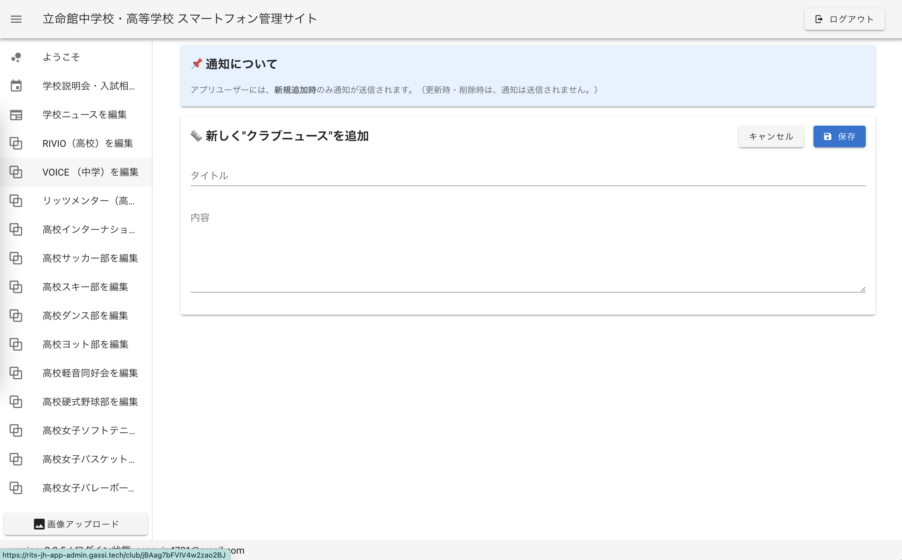 | 対象URL | https://rits-jh-app-admin.gassi.tech/club/クラブID/news/new(各クラブでIDは、異なります) |